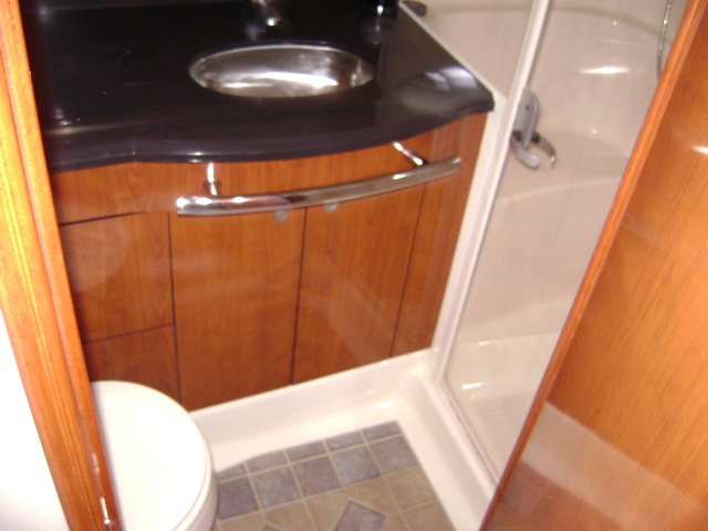 Guest head has shower with seat, adjustable shower wand and acrylic door. Vanity with solid surface countertop and stainless steel sink with Grohe faucet and storage below. Handrail, stainless steel. VacuFlush head. Power Vent, 12V. Mirrored medicine cabinet for storage.