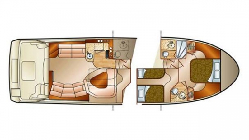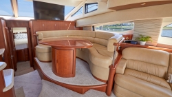 The 43 Sport Bridge remains one of Silverton’s more rakish, distinctive designs. With her generous beam and spacious, full-width salon, this is a big 43-footer with more interior space than most other boats in her class. Her vast salon, with its cherrywood joinery, facing leather settees and sculptured overhead panels, has a large, U-shaped galley forward, opposite an elevated dinette with circular seating for five.
