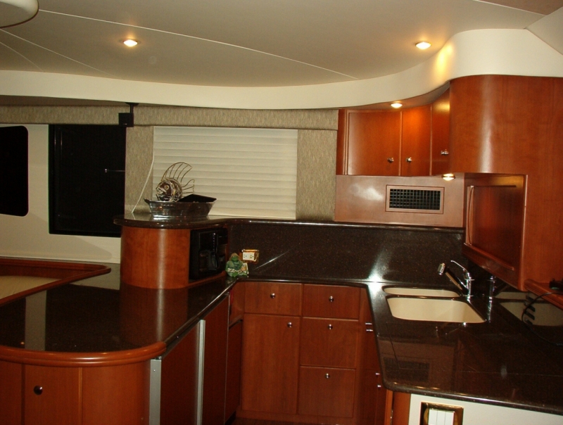 Galley is located on the port side and across to the starboard is the dinette. Corian countertops and cherry cabinetry are featured throughout as well as in- sole storage locker with pantry.