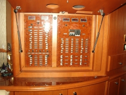 Bridge has custom burl wood panels for the electronics - replacing the maligned original setup. Bridge has CD/stereo, DVD/LCD TV and climate control!