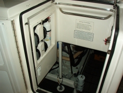 Fresh water/heated shed storage w/surface covers shows she's nothing like a saltwater boat. Not a flaw - she's identical to new. Cockpit engine room door w/ear protection. Bow cushion sun pad. Forward, bridge and cockpit fresh water washdown. Cockpit icemaker in cabinet. Custom stainless anchor. Flybridge refrigerator.