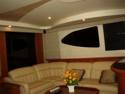 The balance of the main salon includes an L-shaped ultra leather sofa with storage and a built in recliner to port. Designer fabrics. Opposite to starboard a built in entertainment center which includes a 30" flat screen television and Bose surround system with subwoofer. The interior veneers are cherry and featured throughout the vessel are matching drapes, spreads and blinds.