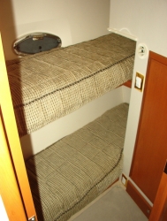 VIP guest stateroom features an island queen berth with drawer and cabinet storage below. There is a 15" flat screen television with DVD, separate DISH network satellite TV receiver and Sony 52WX4 XM satellite radio ready stereo. Hanging lockers and private access to the guest head which includes a separate stall shower. Guest Stateroom aft to starboard features over/under bunks with cabinet storage. The washer and dryer is located just forward of the guest stateroom.