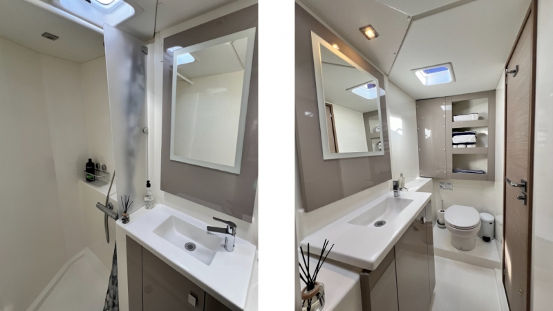 A single owner, owner operated (never chartered) US documented and IMPORTED (no duties or tariffs) 3 stateroom/2 head yacht offering the owner plenty of privacy and space as the entire starboard hull is dedicated to the master stateroom, office area, ensuite head and stall shower. Two guest staterooms and a shared head and stall shower comprise the port hull.