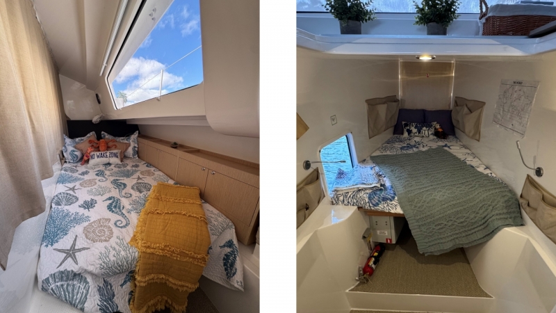 Guest staterooms are a few steps down in the port and center hulls.