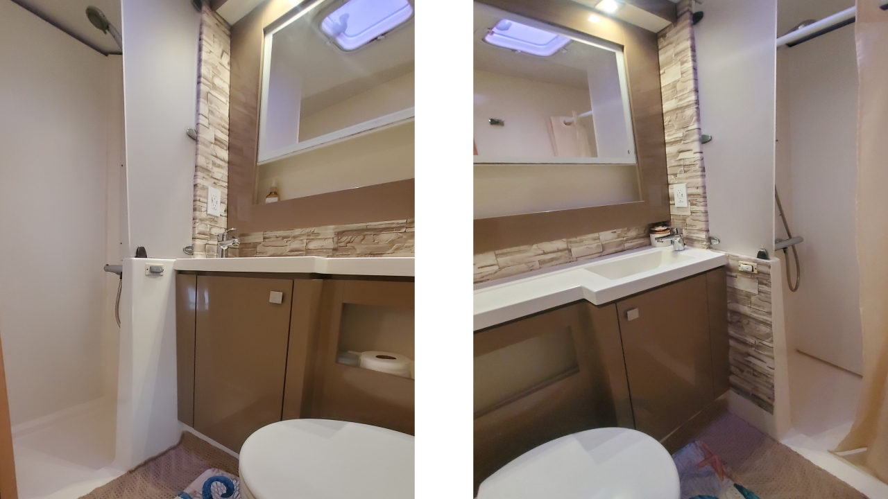 Island queen w/mattress topper; ensuite private head. Electric freshwater head; stall shower with automatic sump (no switches); plenty of storage; desk; hanging locker; under-bed storage; washer access.